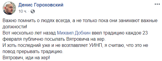 Вот несколько лет назад Михаил Добкин ввел традицию каждое 23 февраля публично посылать Вятровича на х...р.