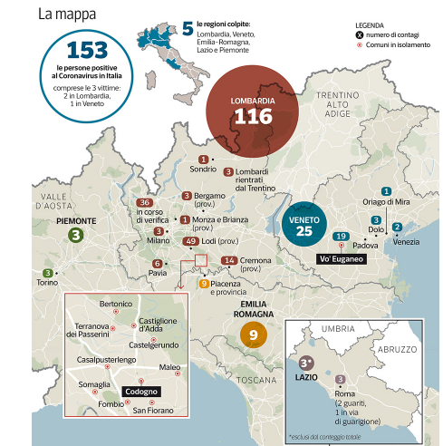 Число зараженных выросло до 153 человека. Большинство из них находятся в северных регионах Ломбардия (116 человек) и Венето (25 человек).