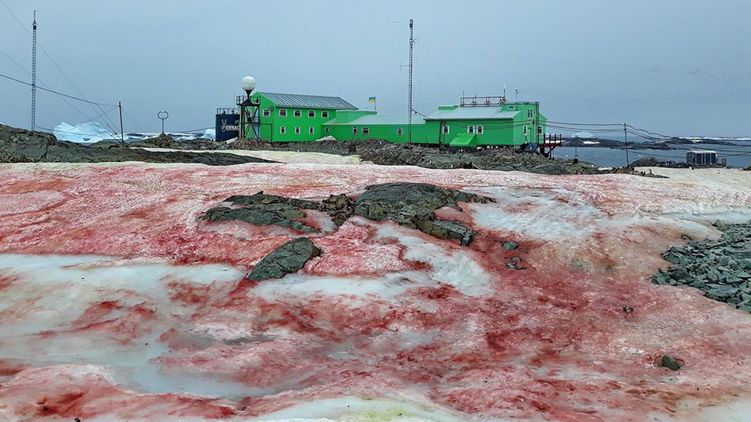 Украинскую антарктическую станцию "Академик Вернадский" покрыл малиновый снег. Ученые объясняют, что такую окраску он приобрел из-за микроскопических снежных водорослей. Наши ученые их определили под микроскопом как хламидомонады Chlamydomonas nivalis. Об этом сообщается на странице Минобразования в соцсети.