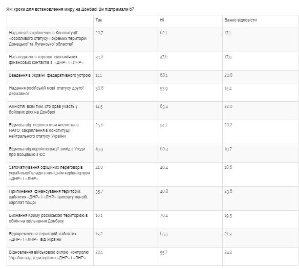 "Противоречивым является общественное мнение относительно начала официальных переговоров украинской власти с нынешним руководством "ДНР" и "ЛНР" – доля тех, кто поддерживает эту идею (41%), статистически значимо не отличается от доли тех, кто ее не поддерживает (40%)", - говорится в сообщении.