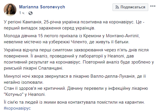 О заразившейся украинке также написала в Facebook журналист Марьяна Сороневич.