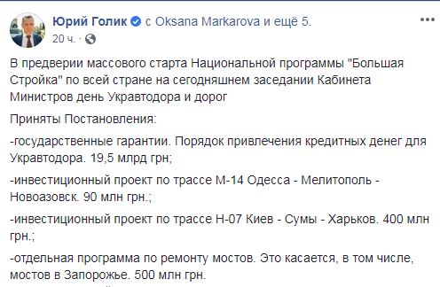 "В преддверии массового старта Национальной программы "Большая Стройка" по всей стране на  заседании Кабинета Министров - день "Укравтодора" и дорог", - сообщает Голик.