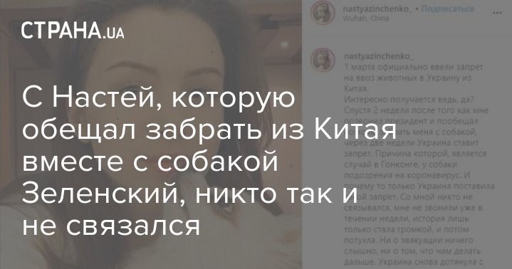 Анастасия Зинченко, которой посольство Украины не разрешило взять с собой собаку во время эвакуации из провинции Ухань, а позже президент Зеленский обещал доставить домой, до сих пор находится в Китае.