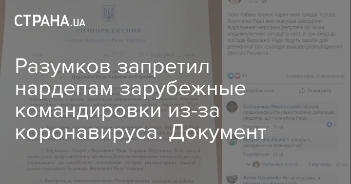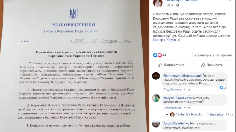"Пока Кабмин планирует карантинные мероприятия, глава Верховной Рады уже отменил зарубежные командировки народных депутатов до изменения эпидемиологической ситуации в мире. А при входе в подъезды Верховной рРады будут средства для дезинфекции рук. Сегодня вышло распоряжение Дмитрия Разумкова", - написала Евгения Кравчук.