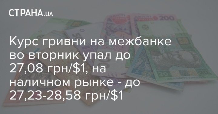 Курс гривни на межбанке во вторник упал до 27,08 грн/$1, на наличном рынке - до 27,23-28,58 грн/$1