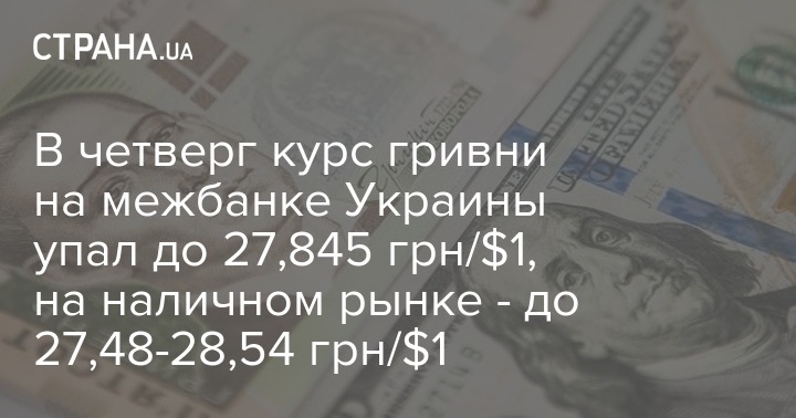 В четверг курс гривни на межбанке Украины упал до 27,845 грн/$1, на наличном рынке - до 27,48-28,54 грн/$1