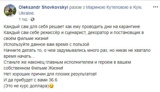 "Каждый сам для себя решает как ему проводить дни на карантине. Каждый сам себе режиссёр и сценарист, декоратор и постановщик в своем фильме жизни! Используйте данное вам время с пользой. Начните делать то, о чем задумывались много раз, но никак не хватало время начать... Станьте же наконец главным исполнителем и героем в вашем собственном Фильме Жизни! Нет хороших причин для плохих результатов! И да прибудет с вами 36,6. Это не курс доллара", -  поделился с читателями Александр Шовковский.