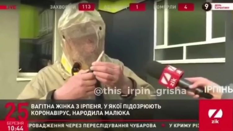 Как рассказал герой ролика, его костюм - это израильская защита, которую ему вчера привезли волонтеры ирпенского совета. Кто именно находится в защитном костюме, в ролике не указано.