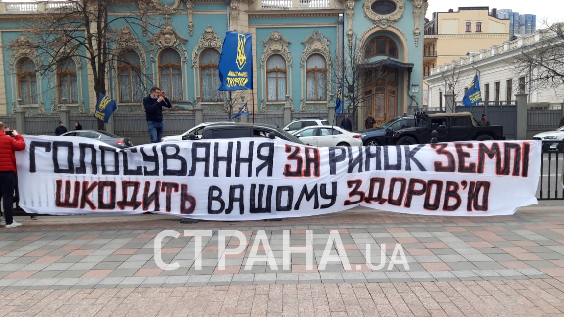 Остальные автомобили заблокированы по городу, заявили в Нацкорпусе. Повесили баннер "голосование за рынок земли вредит вашему здоровью". Протест больше напоминает автопробег. Участники акции требуют, чтобы Верховная Рада закрылась на карантин, а также они против продажи земли.