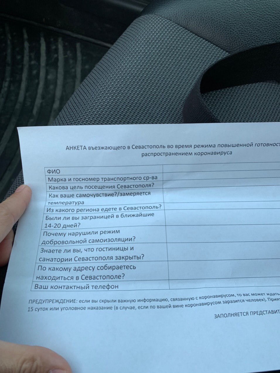 13:26 Севастополь развернул пункты пропуска на подъезде к городу. Все въезжающие автомобили в целях недопущения распространения коронавируса, люди заполняют анкету.