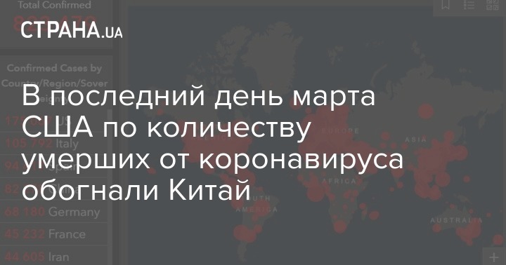 В США число смертей от коронавируса превысило китайский показатель. В Соединенных Штатах к вечеру 31 марта скончались 3415 человек, а в Китае за время эпидемии - 3309 человек.