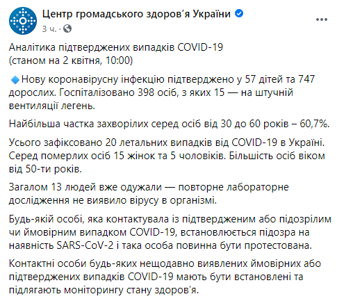 Также уточняется, что всего в Украине зафиксировано 20 летальных случаев от COVID-19. Среди умерших 15 женщин и 5 мужчин. Большинство людей в возрасте от 50 лет.