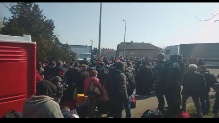 Сотни украинцев пытаются вернуться на родину через КПП "Тиса" в Чопе. Люди часами стоят в гигантской очереди, чтобы пересечь границу Украины с Венгрией.