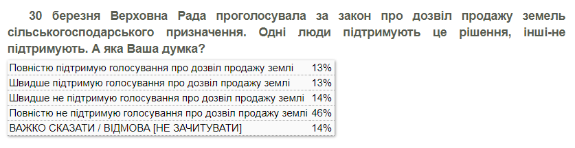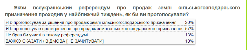 Если бы всеукраинский референдум о продаже земли сельскохозяйственного назначения проходил в ближайшую неделю, 26% тех, кто принял бы участие в голосовании, проголосовали за продажу земли. А 74% людей отдали бы голоса против продажи земли.