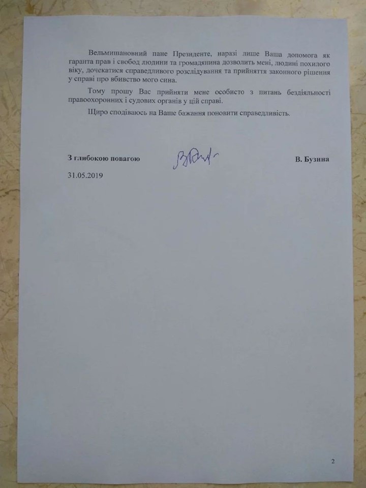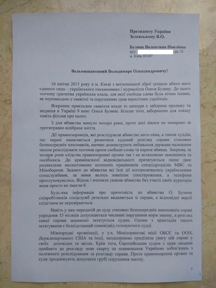В конце мая - когда новый президент уже вступил в должность - мама Олеся Бузины написала ему письмо. Она рассказала Зеленскому, как затягивают дело и избегают вообще говорить о заказчиках преступления.