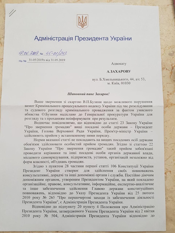 В конце октября мама Олеся Бузины попросила о приеме генпрокурора Руслана Рябошапку. Но и он, вслед за президентом, ей отказал