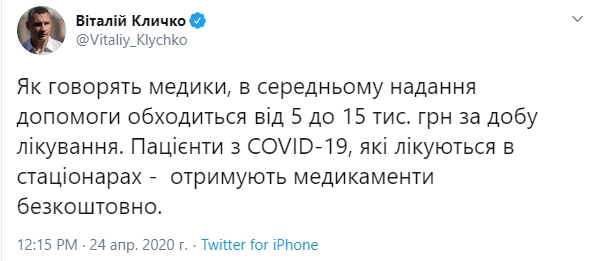 В свою очередь мэр Киева Виталий Кличко 24 апреля сообщил в Twitter, что, по словам медиков, сутки лечения больного коронавирусом обходятся в 5-15 тысяч гривен. Пациенты с Covid-19, которые лечатся в больницах, получают медикаменты бесплатно.