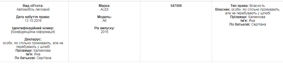 В результате в декларации за 2017 год чиновник был вынужден сообщить, что авто принадлежит его гражданской супруге Яне Калмыковой: