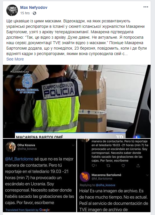 "Видеокадры, на которых разгружают украинские респираторы в Испании в сюжете испанской журналистки Макарены Бартоломе, взяты из архива телерадиокомпании. Макарена подтвердила дословно: "Да, это видео из архива. Очень древнее. Не актуальное. Я попросила наш сервис документации TVE найти видео с масками ", – отметил чиновник.