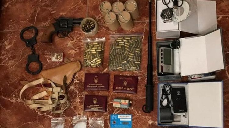Во время обысков по месту жительства злоумышленников были найдены изъяты 9 пистолетов, боеприпасы, полицейский мундир и жетоны, разные удостоверения ( в том числе сотрудников полиции, СБУ, Офиса президента, налоговой службы), шевроны с надписями "СБУ" и "Полиция", наручники, дубинки, мобильные телефоны, более 35 000 долларов США и 500 евро, банковские карточки, большое количество наркотиков (амфетамин, метадон, героин).
