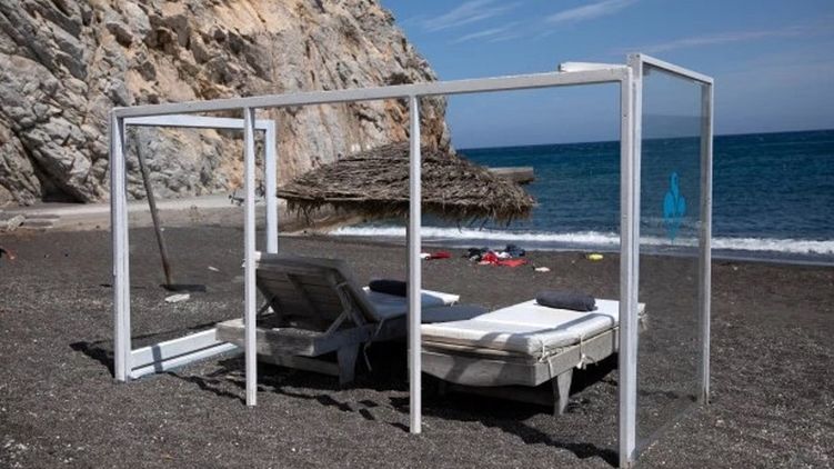 Пляжи в Санторини (Греции) начали подготовку к приему туристов. Для них соорудят специальные кабинки из плексигласа (органического стекла).