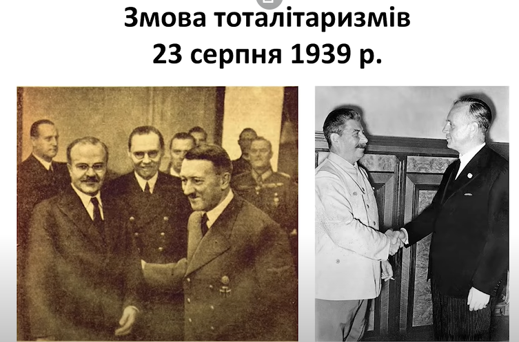 Урок "Вторая мировая война: украинское измерение" начался с картинки подписания пакта Молотова-Риббентропа. С понятным намеком, кто начал всемирную бойню. Но предварительно Дробович начал обсуждать Первую мировую и ее невыученные уроки – которые и привели ко Второй мировой.