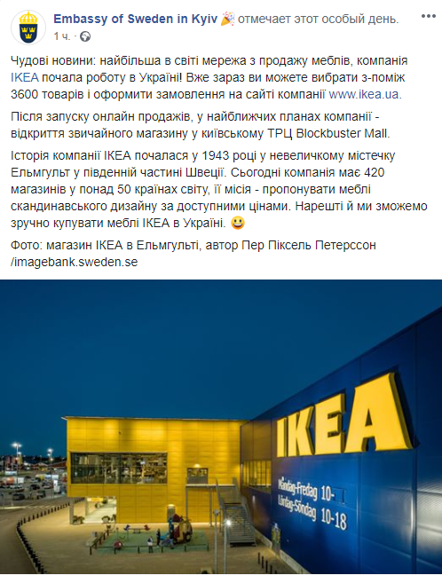 Известная шведская компания IKEA, которая известна, как  крупнейший в мире ритейлер мебели и товаров для дома, запустила онлайн продажи в Украине с пунктами выдачи заказов в киевских ТЦ (Auchan Rive Gauche) и ТЦ Metro Cash & Carry. Об этом сообщается на странице Embassy of Sweden in Kyiv в соцсети.