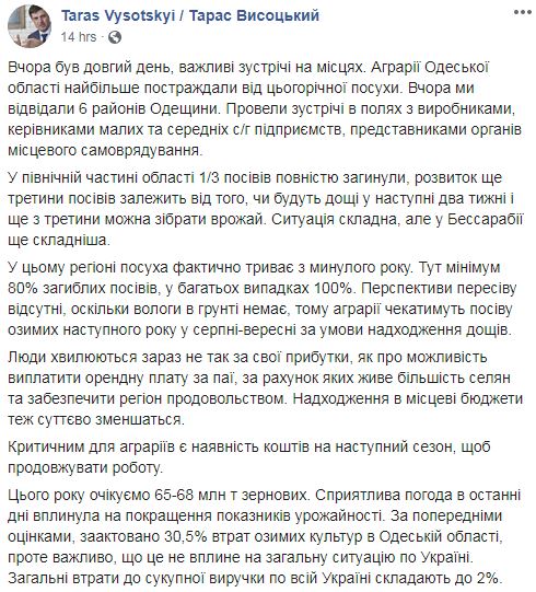 "По предварительным оценкам, заактировано 30,5% потерь озимых культур в Одесской области, однако важно, что это не повлияет на общую ситуацию по Украине", - написал Высоцкий.