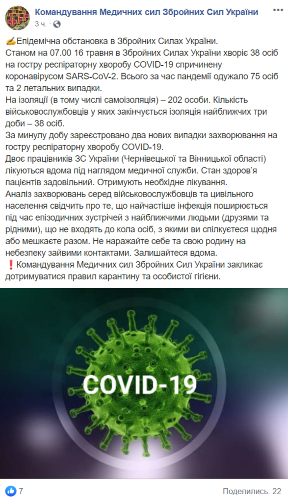 В ВСУ коронавирусом заболели еще двое человек. Всего в армии болеют 38 военных. Фото: facebook.com/Ukrmilitarymedic