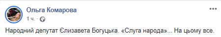 Возмутилась в соцсети и журналист Ольга Комарова. "Народный депутат Елизавета Богуцкая. "Слуга народа" ... На этом все", - написала в соцсети журналистка.
