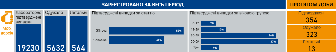 По состоянию на утро среды, 20 мая, в Украине выявили уже 19 230 случаев инфицирования коронавирусом. В это же время вчера, 19 мая, сообщалось о 18 876 случаях. За сутки выявлено 354 новых заболевших, выздоровело 323 пациента, умерли 13 человек.
