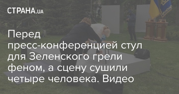 Утром в среду, 20 мая, перед пресс-конференцией Владимира Зеленского в Киеве пошел дождь. Мероприятие проходило под открытым небом, поэтому стул и сцена, подготовленные для главы государства, промокли. Перед появлением президента их сушили, в том числе при помощи фена.
