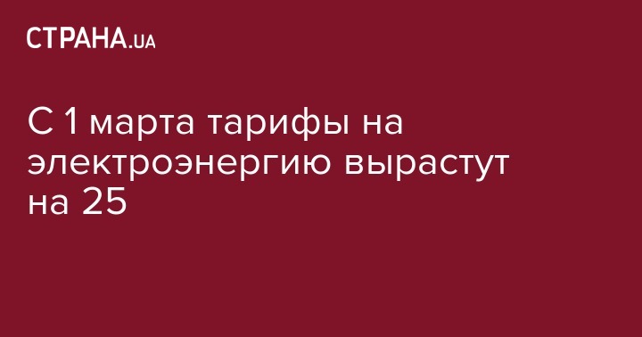 В Украине с 1 марта тарифы на электроэнергию в среднем вырастут на 25%. Повышение тарифов предусмотрено постановлением № 220 "Об установлении тарифов на электроэнергию, отпускаемую населению" от 26 февраля 2015 года Национальной комиссии по государственному регулированию в сферах энергетики и коммунальных услуг.