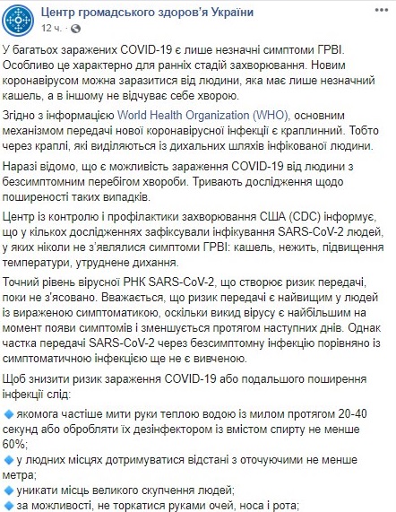 "У многих зараженных COVID-19 есть только незначительные симптомы ОРВИ. Особенно это характерно для ранних стадий заболевания. Новым коронавирусом можно заразиться от человека, который имеет лишь незначительный кашель, а в другом не чувствует себя больным. Согласно информации World Health Organization, основным механизмом передачи новой коронавирусной инфекции является капельный. То есть через капли, выделяемые из дыхательных путей инфицированного человека", – указано в сообщении.