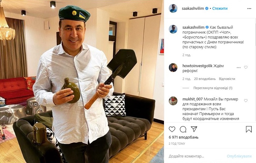 "Как бывалый пограничник". Саакашвили с лопатой и флягой поздравил пограничников с профессиональным праздником. Фото: Twitter