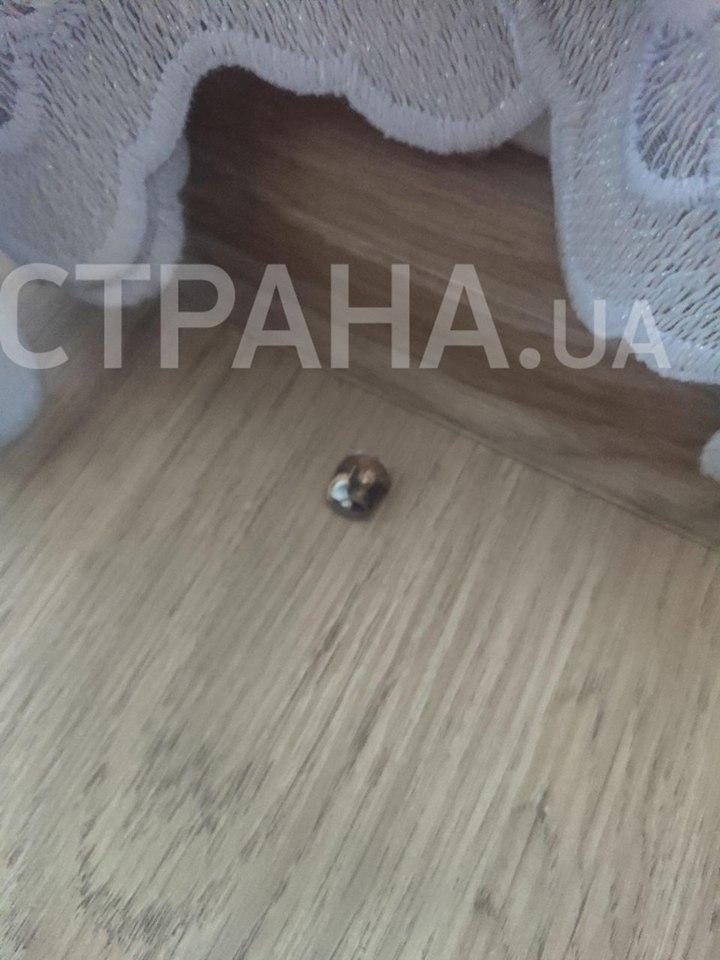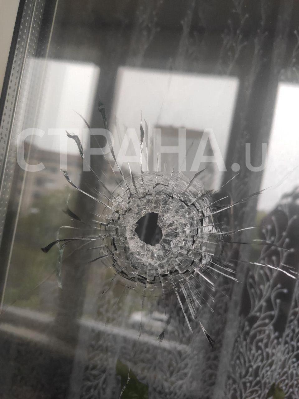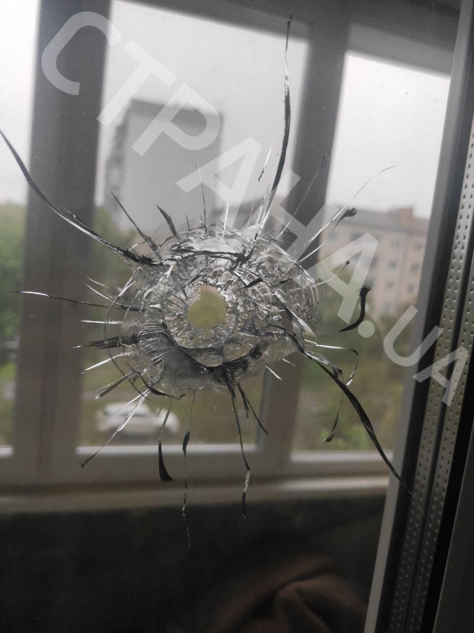 На фото отверстия в окне видно, что сначала пуля пробила оконную раму балкона, а затем уже прошла через окно в комнату. Также можно рассмотреть, что квартира расположена на высоком этаже.