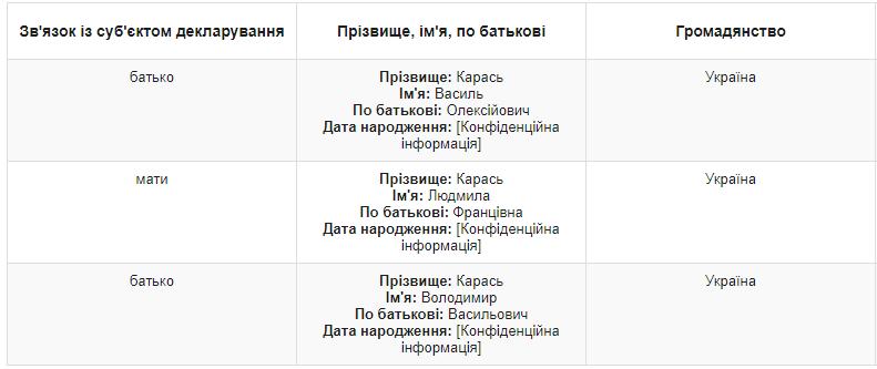 В графе о членах семьи Евгений Карась указал мать - Людмилу Францевну и двоих отцов: Карася Василия Алексеевича и Карася Владимира Васильевича. Хотя логично предположить, что последний, скорее всего, приходится ему братом.
