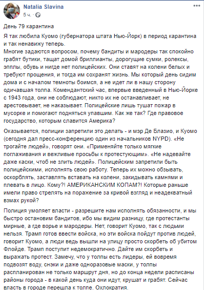 "Многие задаются вопросом, почему бандиты и мародеры так спокойно грабят бутики, тащат домой бриллианты, дорогущие сумки, ролексы, эпплы, обувь и нигде нет полицейских. Они ставят на колени белых и требуют прощения, и тогда им сохранят жизнь. Мы который день сидим дома и с началом темноты боимся, а не идет ли в нашу сторону одичавшая толпа. Комендантский час, впервые введенный в Нью-Йорке с 1943 года, они не соблюдают, никто их не останавливает, не арестовывает, не наказывает. Полицейские лишь тушат пожар в мусорке и помогают подняться упавшим. Как же так?" - пишет Славина.