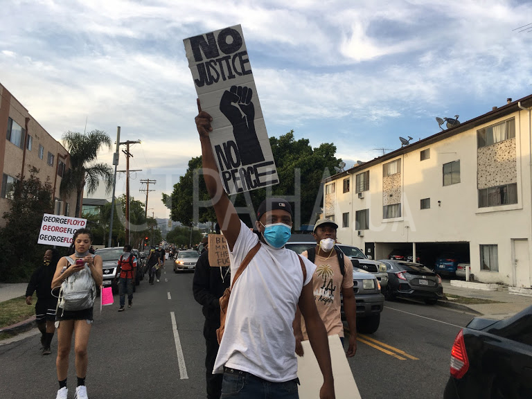 "Нет справедливости - нет мира", - еще одно популярное требование на улицах Лос-Анджелеса.