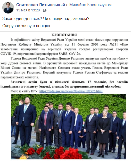 Подает Литинский не только "мовные" иски. Недавно он написал заявление в полицию на "Слуг народа" за возложение цветов ко Дню Победы. Основание - они были без масок.