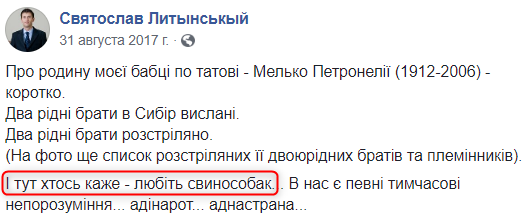Правда, в Фейсбуке он себя именует "Святослав Литынськый". Видимо, пытаясь потроллить русский язык. Что уже говорит о многом.