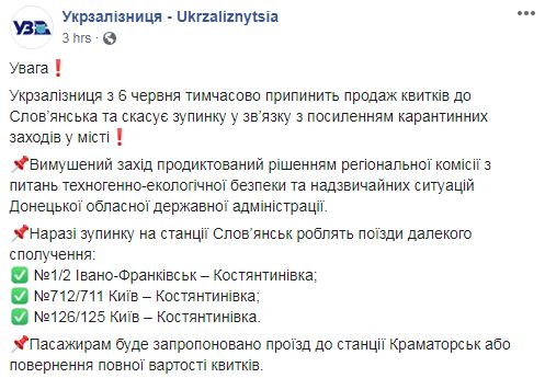 "Укрзализныця с 6 июня временно прекратит продажу билетов до Славянска и отменит остановку в связи с усилением карантинных мероприятий в городе. Вынужденная мера продиктована решением региональной комиссии по вопросам техногенно-экологической безопасности и чрезвычайных ситуаций Донецкой ОГА", - говорится в сообщении.