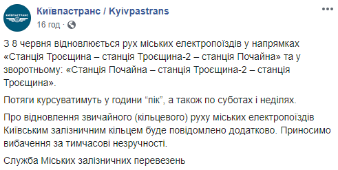 "С 8 июня возобновляется движение городских электропоездов по направлениям "Станция Троещина - станция Троещина-2 - станция Почайна" и в обратном: "Станция Почайна - станция Троещина-2 - станция Троещина", - сообщает Киевпастранс.