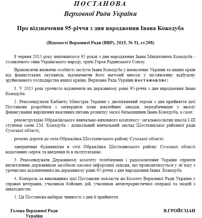 В этом же году, ровно через месяц, праздновалось 95-летие Кожедуба. Вышло постановление Верховной Рады, подписанное спикером Владимиром Гройсманом. Там предписывалось отметить юбилей на государственном уровне, а заодно отремонтировать школу и техникум, где учился герой, и дорогу в село Ображиевка, где он жил.