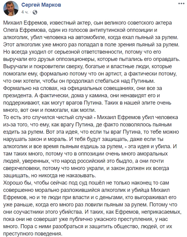 "Михаил Ефремов, известный актер, сын великого советского актера Олега Ефремова, один из голосов антипутинской оппозиции и алкоголик, убил человека на автомобиле, когда ехал пьяный за рулем, - пишет политолог Сергей Марков. - Этот алкоголик уже много раз попадал в поле зрения пьяный за рулем. Но всегда уходил от серьезной ответственности, потому что его выручали его друзья оппозиционеры, которые пытались его оправдать.