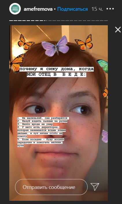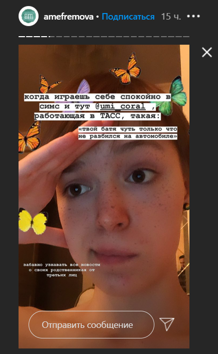 Девушка реагировала довольно спокойно. После того, как ей сообщили, что ее отец только что едва не разбился на авто она опубликовала сторис и написала: "Впрочем, ничего нового".