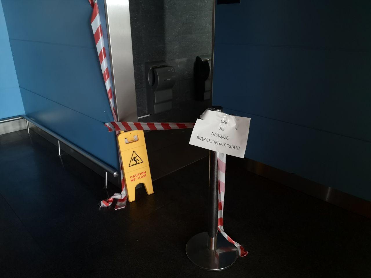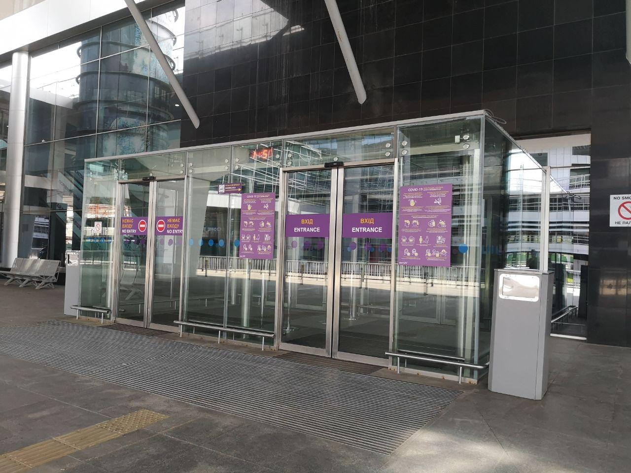 Одно уличное кафе возле входа в Терминал D закрыто, сам центральный вход также перекрыт. На дверях объявление, что вход в Терминал - только с правой стороны первого этажа. Возле единственного открытого входа работает МАФ, где можно купить кофе и перекусить. Внутри Терминала D кафе не работают. Туалет также закрыт - в объявлении сказано, что отключена вода.