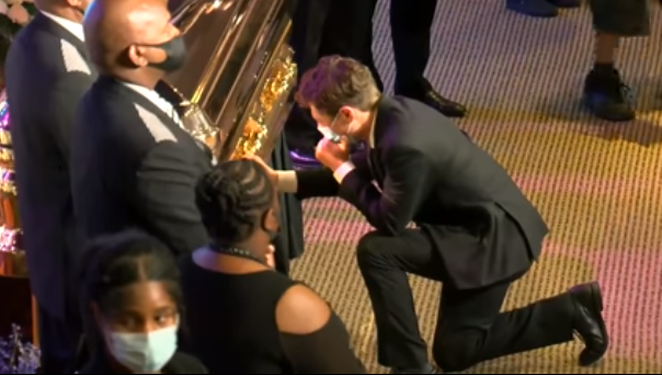 Мэр Миннеаполиса Джейкоб Фрэй преклонил колено перед гробом с телом Флойда и заплакал. Скриншот: News 19 WLTX/YouTube