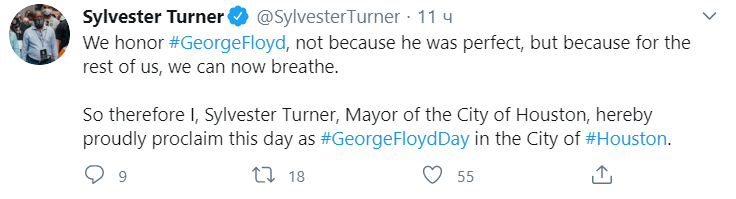 "Поэтому я, мэр города Хьюстон Сильвестр Тернер, с гордостью объявляю этот день Днем Джорджа Флойда в Хьюстоне", - написал он в соцсети.