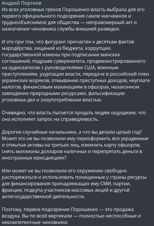 "Из всех уголовных грехов Порошенко власть выбрала для его первого официального подозрения самое никчемное и труднообъяснимое для общества — неправомерный акт о назначении чиновника службы внешней разведки.